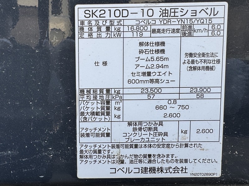 - SK210D-10 併用配管 🇲🇾マレーシア向け輸出 バケットあり解体仕様機 コベルコ建機 0.7油圧ショベル